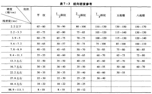 由于纬密在试织过程小可以调节,所以,纬密设计有较大的灵敏性,但是一些对纹样外形要求严格的织物,如团花、方格、象景等不能任意调节,否则会使花纹变形而成次品。设计时,织物的纬密一般比经密少,这主要是经丝的线密度较细,经丝质量好,上机张力大,丝完足,对织物质地方较大的影响,纬密小有利于提高生产效率,产生织疵易拆纬等。经向密度参考见表7—3。