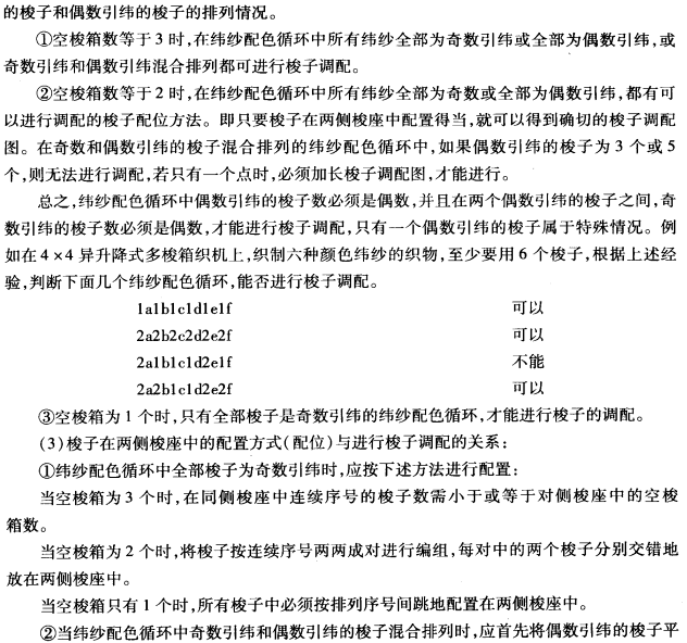 所谓能进行调配,即在整个调配过程中,每种纬纱的梭子都有适当的梭箱被其利用。并且当全部的梭子都已回到各自原来的梭箱时,恰好完成几个(正整数)纬纱配色循环。能进行梭子调配,说明具有这种纬纱配色循环的织物,能在某一特定的织机上织制。相反,不能进行梭子调配,就是不能在织机上进行织造。织物能否在织机上织造,还需满足以下几个条件:
