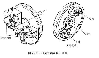 (2)行星轮绳状绞边装置图3-23所示的是齿轮传动的行星绳状绞边装置中的行星轮结合件。图中a、b两轴分别为绞边线架的转轴中心,两线架一方面绕c轴旋转,另一方面又各自绕a、b轴自转即形成绳状边。