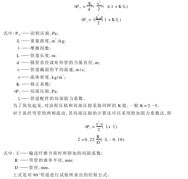 在输送子棉或皮棉时,其压强损失或压力降,比在同一速度下输送空气时要大,输送材料越多,压强损失越大,因此在纤维介质和空气混合的两相流动中,在处理工程问题中,为了简化起见,可以按照纯空气流动时的压强损失乘以修正系数进行计算,即沿程压损ΔP m 和局部压损ΔPj为: