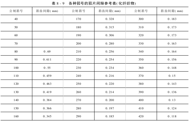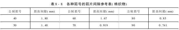 合适的筘隙对于喷气织机效率及织物的质量是特别必要的,推举的筘隙仅能作为参考,适合的筘隙只能通过实践经验,对纺纱线织物的种类全方位熟知才能完全达到。表8-8、表8-9是棉织物、化学纤维织物各种筘号的筘片间隙参考表。