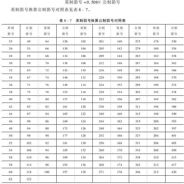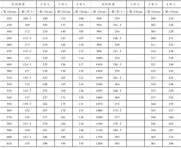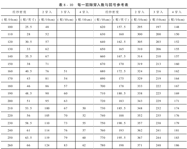 织物在试织时,可根据经纱密度参考表预选用筘号。经试织后,适度调整后决策正式使用的筘号,表8-10适用于地经组织每一筘隙穿入2,3,4根的筘号。