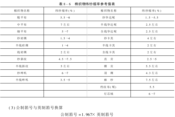 (1)公制筘号的选用:公制筘号可按下式计算,一般取整数,筘号范围50~330筘/10cm,化学纤维70~400筘/10cm。