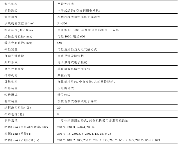 送经和卷取系统 积极式送经机构采纳复式调节系统,保证送经均匀和送经张力稳定。卷取机构由蜗杆、蜗轮及链轮积极连续的传动卷取辊,实现连续卷取。纬密调节器和送经卷取机构联动,主纬密范围30~800根/10cm。