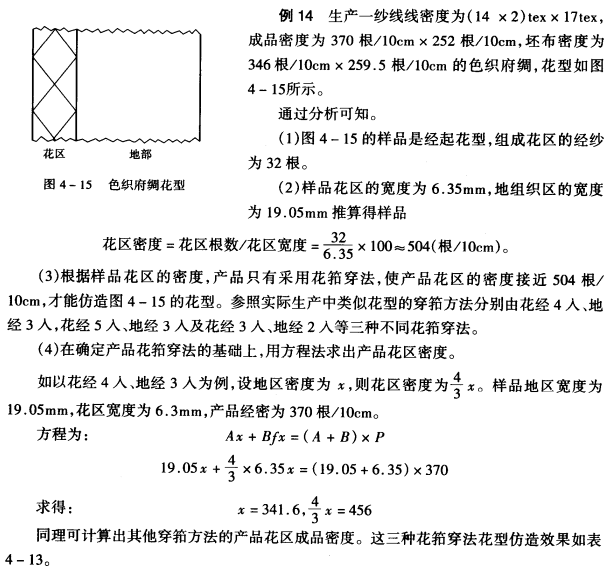 (4)综合调整法:当产品和样品的经、纬密度均有很大差异酌情况下,在仿祥时综合运用调整穿箱法和调整花经法来保持样品花型的宽度,用改变花经组织点的方法来保持样品花型的长度,这种仿制花型的方法简称综合调整法。