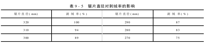 锯片直径大,伸入到工作箱中的锯片弧线长,工作齿数多,剥绒效率高;锯片直径小,伸入工作箱中的锯片弧线短,工作齿数少,剥绒率低。锯片直径对剥绒率的影响见表9-5。