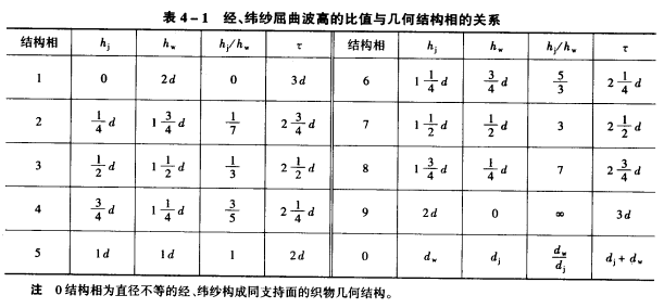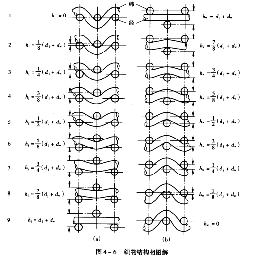 经、纬纱的屈曲波形是在两种极端状态之间变化的,这种变化对织物的性能和外观有重要影响。经、纬纱的屈曲波形在这两种极端状态之间可以连续地变化,可以有无数种屈曲状态。但是为了便于研究和比较,需要设定一些非常的波形状态。经、纬纱在特定波形时的几何结构状态称为织物的几何结构相,简称结构相。
