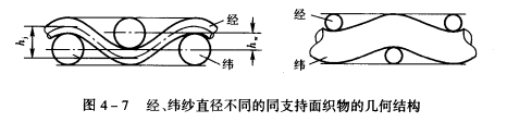 这样的结构相,定义为0(零)结构相。在这种条件下的织物切面图如图4—7所示。织物的几何结构相不同或支持面不同时,其性能和风格不同。在许多传统的织物中,对应于织物的风格特征,都具有相应的几何结构相。例如,府绸或卡其等织物,都是经纱线支数持面,必须具有较高的几何结构相;麻纱、横贡缎和拉绒本色棉布,都是纬纱线支数持面,必须具有较低的几何结构相;各类平布、涤棉织物和胶管帆布类织物,经、纬纱在织物的使用过程中,同时承受外力的作用,都需要构成同支持面的织物。因此,这些织物的几何结构相,一般都处于第5结构相或者,0结构相附近。