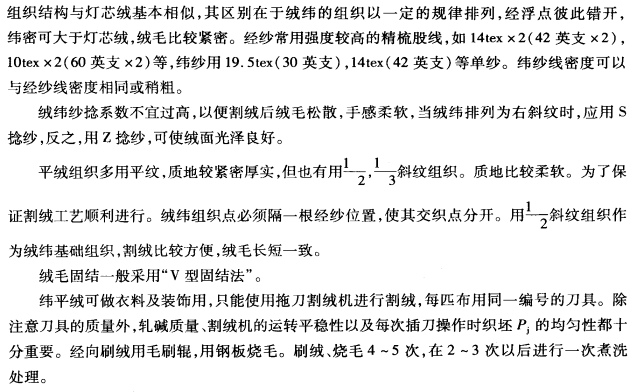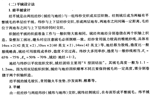 织制经平绒时,因为单层起毛杆织制法的生产效率低,所以,一般都用双层织制法。平绒织物和灯芯绒织物的性能相似,只是形成绒毛的系统及特征不相同。