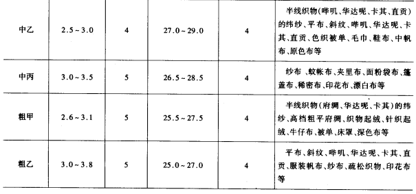 (3)中特纱:中特纱的质量一般低于细持纱。所以应选择色泽略次、品级稍低(2.3~3.5级)、成熟度和纤维线密度一般,长度较短(26.5~29.5mm)、杂质疵点较少的原棉。