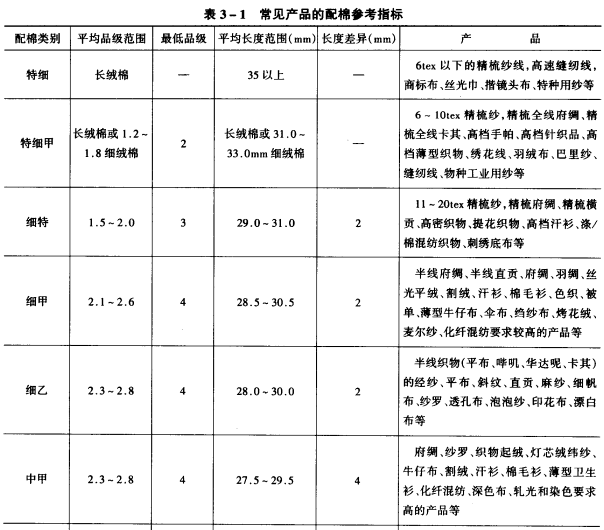 一些常规产品的配棉参考方案见表3-1.
