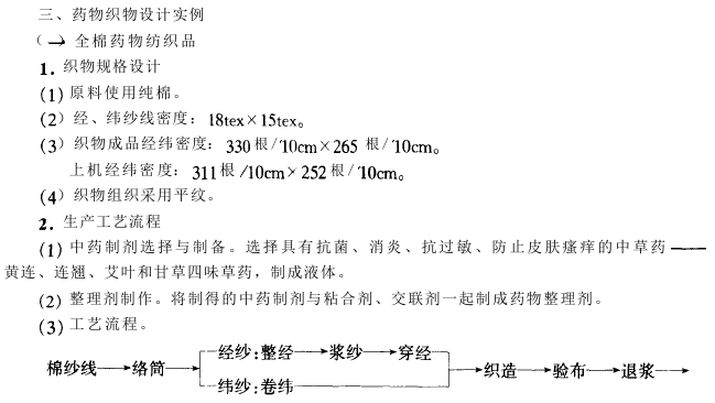 一、抑菌织物设计实例 (一)抑菌非织造布的设计和生产 1.生产方法及工艺流程 (1).生产方法。可采纳纺丝成网法、热轧法、水力喷刺法等工艺。