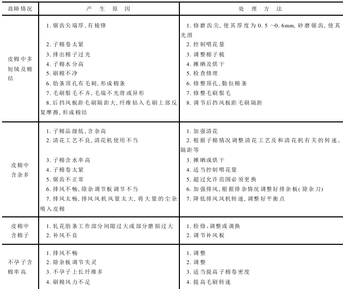 锯齿轧花工艺的常见故障可分为生产性故障和机械性故障两类。生产性故障指影响产量和质量的故障,机械性故障是阻碍机器正常运转的故障。锯齿轧花机常见故障的原因及处理方法见表8-7。
