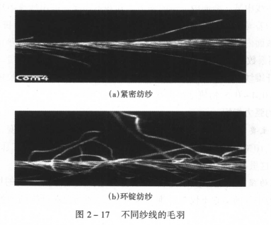 纺纱线毛羽指的是伸出纺纱线主体的纤维端或圈。毛羽的情况错综复杂,千变万化,伸出纺纱线的毛羽有端、有圈及表面附着纤维,而且具有方向性和很强的可动性,如图2—17所示。