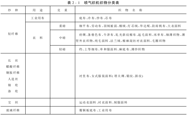 喷气织机织造范围见图2-1。喷气织机织物分类见表2-1。