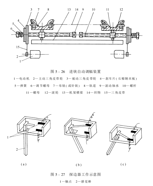 探边器有簧片式、完电式和水银触点式等多种。图5-27所示为常用的簧片式探边器。探边器和自动调幅装置共同调整织物边。图5-27(b)所示为织物边缘位置正常,触杆处于垂直状态,调幅电动机不动的情况;当织物边缘外移到肯定位置,触杆随之外摆,使连杆触头和上触头相接触,见图5-27(a),该边调幅电动机按需要方向转动,带动该边导布板外移;当织物边缘内移超过正常位置达到图5-27(c)所示的状态时,连杆触头和下触头相接触,该边调幅电动机带动导布板内移。为了减少电动机停止转动时产生的惯性,在两只调幅丝杆的三角皮带轮外侧各装一套制动片和压力弹簧。
