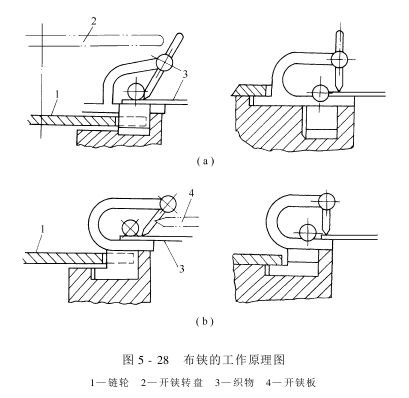 布铗的工作原理如图5-28(a)所示。在布铗链的进布端,由于布铗链轮上方的开铗转盘的作用,将绕经转盘的有柄布铗打开,使织物的边部进入其间。在布铗离开转盘时,由于滑轮(图5-25)被织物边部托住,不能落入底板的轮槽中,刀口并未夹住织物。待布铗沿该段轨道的开档逐渐加大而使织物边缘外移至肯定位置时,滑轮落至底板轮槽中,刀口触及织物边部,并将它夹住,从而使铗持宽度均匀。出布端织物脱铗时,也是采纳同样方法,打开铗舌。无柄布铗则是采纳酚醛层压板制的开铗板来打开铗舌的,见图5-28(b)。