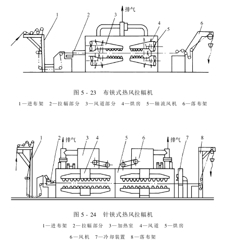 图5-23和图5-24分别是布铗式和针铗式热风烘燥机的结构示意图。它们主要用于棉织物拉幅后整理、上浆和树脂后整理后的烘燥,涤纶及其混纺化纤织物织物轧染DT增白剂的烘燥和拉幅后热定形等。