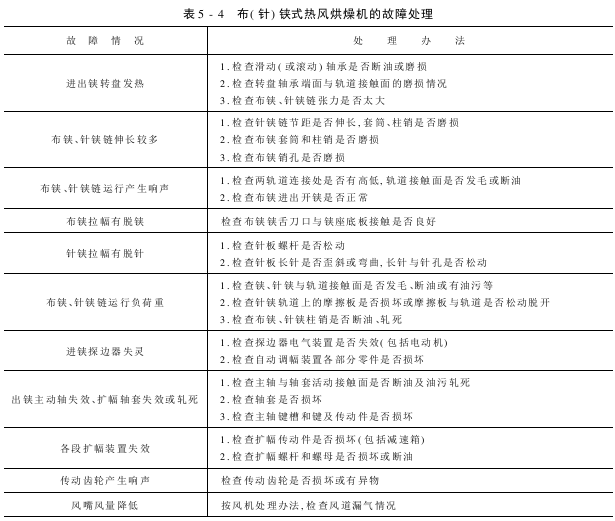 布(针)铗式热风烘燥机的维护保养注意事项和故障处理分别列于表5-3和表5-4中。