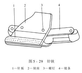 针铗的结构如图5-29所示。针板是针铗中的主要元件,在黄铜针板上,植有稍呈外倾(约8°)间隔相等的长针(尖针)和短针(圆柱针)。织物边部进入针铗时,用两只大小毛刷轮将织物边部压入针板,刺住织物。针的表面应完滑,针尖锐利不能有毛刺,长针刺住织物边,短针阻挡织物边继续向下刺入。长短针向外倾可预防刺入的织物边受到纬向拉力后引起脱针。这样,织物就不能再做纬向移动.