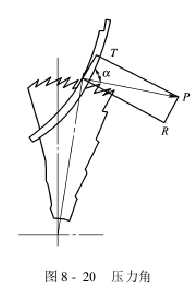随锯齿向工作点移动的子棉,碰到轧花肋条排后马上改变休闲方向和速度,沿着肋条排表面向上休闲。子棉卷在该处的速度慢,为1.1~1.5m/s,但此时密度大。在轧花肋条工作点处,锯齿从棉子上拉脱纤维的能力和轧花肋条和锯片之间的相对位置有很大关系。轧花肋条和锯片相对位置关系,一般用压力角表示。压力角是轧花肋条工作点处的圆弧切线和锯片圆周切线之间的夹角,用字母α表示,如图8-20所示。