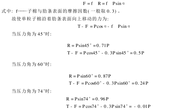 以上计算表明:随着压力角的增大,工作点处的锯齿从棉子上拉脱纤维的作用力逐渐增强,但推动子棉卷运转的作用力逐渐减弱;当压力角增至74°时,工作点处锯齿的运转力P几乎全部用于拉脱子棉纤维,对子棉卷的推力几乎为零。但子棉卷是依靠伸入工作箱内的全部锯齿的推动而运转,故这种情况下,子棉卷未必停转。