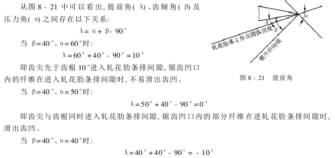 锯齿凹口内的纤维能否全部进入轧花肋条排间隙,在很大程度上取决于锯齿工作边和轧花肋条之间的相对位置。若齿尖先于齿根进入肋条排间隙,轧花肋条对纤维起的作用是将它们压向齿根,齿凹内的纤维能顺利进入肋条排间隙;反之,若使齿根先于齿尖进入肋条排间隙,轧花肋条将齿凹内的纤维推向齿尖,齿凹内的纤维不能进入肋条排间隙。锯齿工作边和轧花肋条之间的相对位置关系,一般用提前角表示。提前角是位于工作点处的锯齿工作边和轧花肋条工作点圆弧切线之间的夹角,用字母λ表示,如图8-21所示。提前角是指齿尖比齿根提前进入工作点间隙的角度.