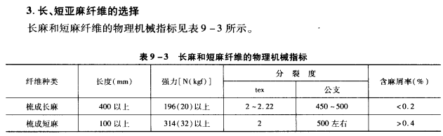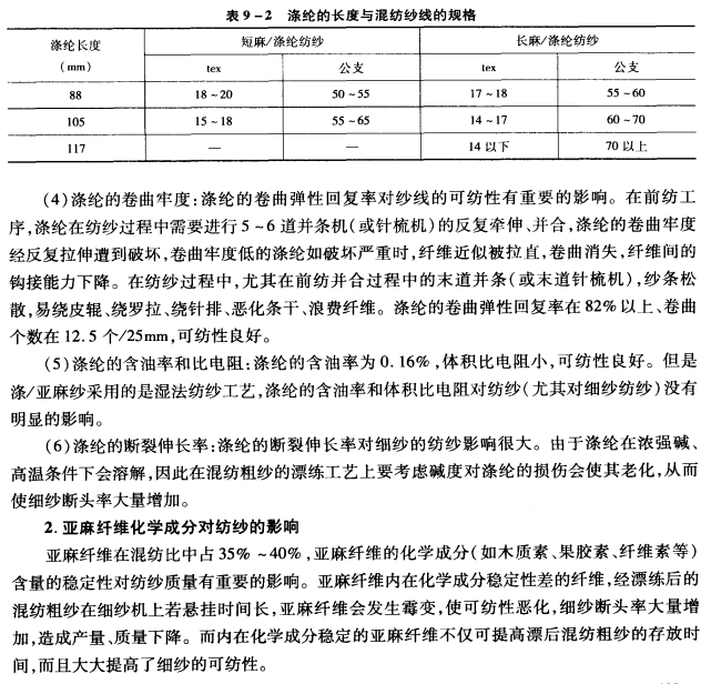 (3)涤纶的线密度:涤纶的线密度和亚麻纤维漂练后的线密度应相近。亚麻纤维漂练后的线密度为5—6.67dtex(1500—2000公支)左右,可选用2.78—3.33dtex(2.5—3旦)涤纶和亚麻纤维混纺化纤织物,选用2.78—3.33dtex(2.5—3旦)涤纶对提高成纱品质有明显的效果。涤纶的长度和混纺化纤织物纺纱线的规格见表9—2所示。