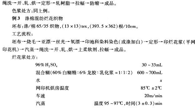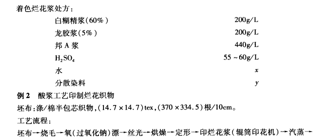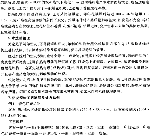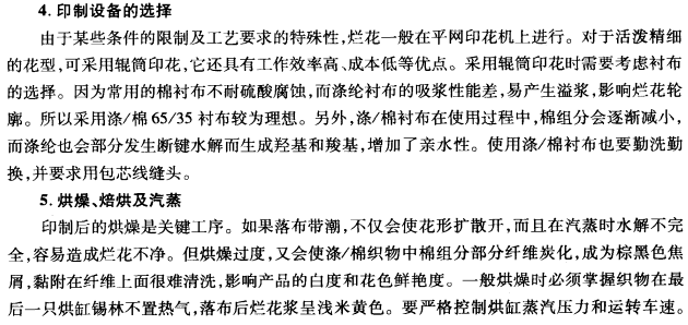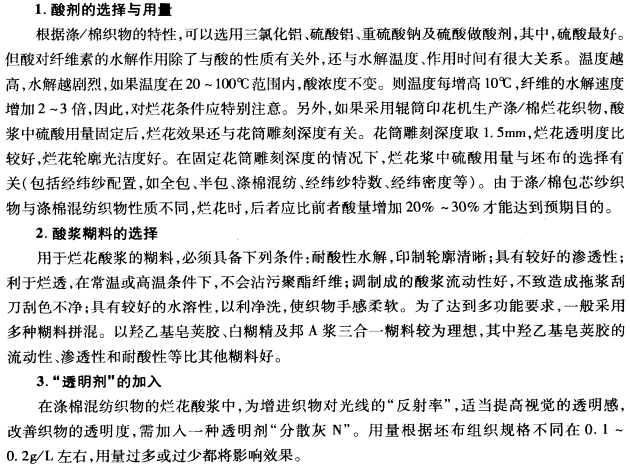 对于烂花织物而言,烂花整理工艺的设计是获得成员风格的员重要的因素,主要包含酸剂和酸浆糊料的选择和用量,印制设备的选择等。