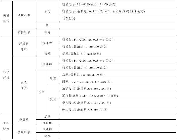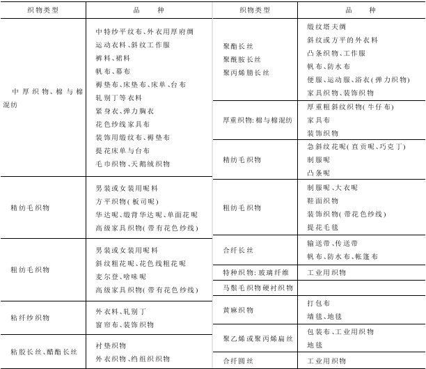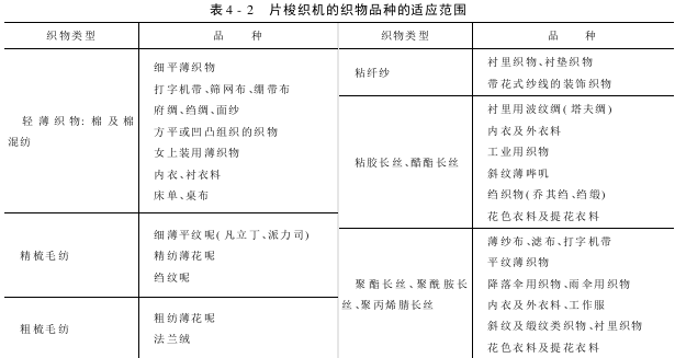 片梭织机是适用范围广的无梭织机,可以织造窄幅或宽幅布:轻薄织物、中厚织物、厚重织物、特种织物以及单色和多色,平纹或复杂图案织物。由于片梭织机是片梭引纬,因此纬纱的适应范围广,纬纱从天然纤维、人造纤维、长丝及裂膜条纱等都能适应。表4-1列出了苏尔寿片梭织机的原材料及纱特数的适应范围,表4-2列出了片梭织机的织物品种的适应范围。