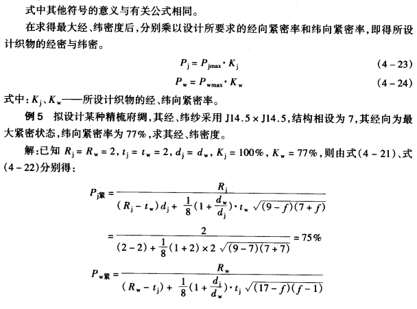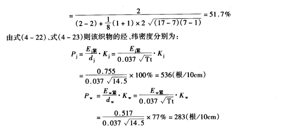 以上为根据织物结构理论计算求得的经、纬密度。对于具有相同平均浮长的不同组织之间的差别,以及纺纱线性质、织造工艺的影响均未考虑,因而和实际情况有肯定的出入。在产品设计时,需作适当调整,更需要在产品试织中作进一步修正。