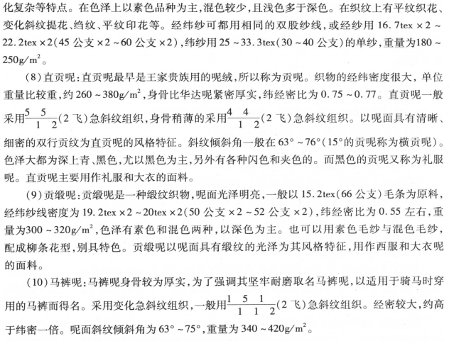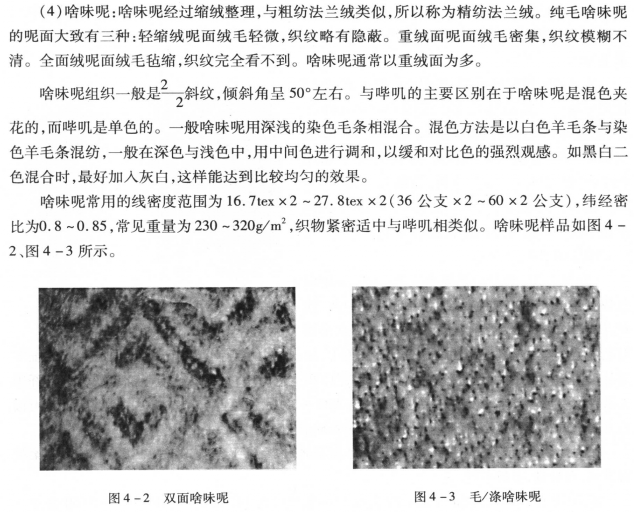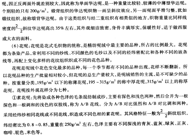 ②呢面织物的呢面要求。混色要非常均匀,呢面茸毛均匀细密,织纹隐而不露或露中带隐,毛茸紧贴呢面,不发毛、不起球。呢面按表面茸毛的稀密要求,进行不同的设计和后后整理。目前流行的呢面类型,大体上有以下五种: