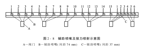 辅助喷嘴在筘座上的分布如图2-8所示,一般情况下,辅助喷嘴以5个为一组,也有2个、3个或4个为一组,每组喷嘴受控于一个电磁阀。因此,同组几个辅助喷嘴的开闭时间是一样的。辅助喷嘴数和筘幅有关,各组喷嘴喷射时间互相衔接,各喷嘴间距通常为60~80mm,标准设定80mm。