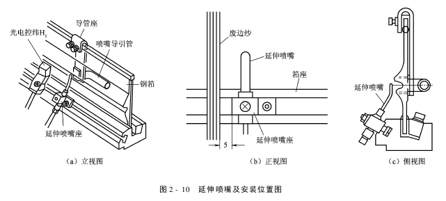 (4)延伸喷嘴:延伸喷嘴也叫牵伸喷嘴,安装在末一只辅助喷嘴之后,位于布幅之外。延伸喷嘴的结构和辅助喷嘴相似,供气时间长,可牵引纬纱伸直。当主、辅喷嘴先后关闭后,延伸喷嘴仍继续保证喷射,以免在综平前纬纱反弹。用于预防纬纱反弹产生纬缩等,多用于纬纱为强捻长丝或包芯纱等场合。采纳较高的气压会增加织机气耗量(图2-10)。