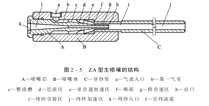 喷气织机主喷嘴由三部分组成,即喷嘴体B、喷嘴芯A、导纱管C。喷嘴内气流通道则由气流加速区、纬纱引射区和纬纱加速区组成。由储纬器引来的纬纱从入口k进入引纬流道l。由主气包来的高压气流从气流入口a进入喷嘴。