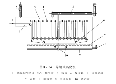 在蒸化机中,织物遇到饱和蒸汽后迅速升温,此时凝聚水能使色浆中的染料、化学试剂溶化,有的还会发生化学反应,渗入纤维中,并向纤维内部扩散,达到固色的目的。所以,蒸化机必须提供完成这一过程所需的温度和湿度条件。根据织物传送形式的不同,蒸化机分为导辊式和长环式两类。